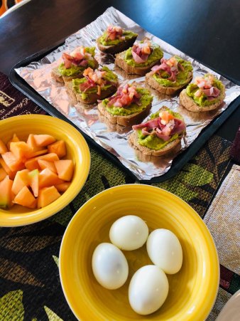 Guacamol, pico de gallo y tiritas de jamón sobre un pan de rodaja tostado