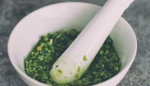 Asar 10 tomates cherry (o más), ajos y hojas de luarel y albahaca por unos 5 minutos. Luego agregar aceite de oliva, sal y pimienta. Tapar y dejar 10 minutos. Machacar y agregar un chorrito de agua.